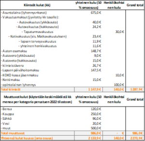 Kuten toisessa artikkelissani kirjoitin, kulut voidaan jakaa normaalin talousopin mukaisesti kiinteisiin esim. kuukausittain tapahtuviin muuttumattomiin kustannuksiin sekä muuttuviin kustannuksiin. Ohessa on taulukoitu lukemia nykyisistä kuukausittaisista kulueristäni:
